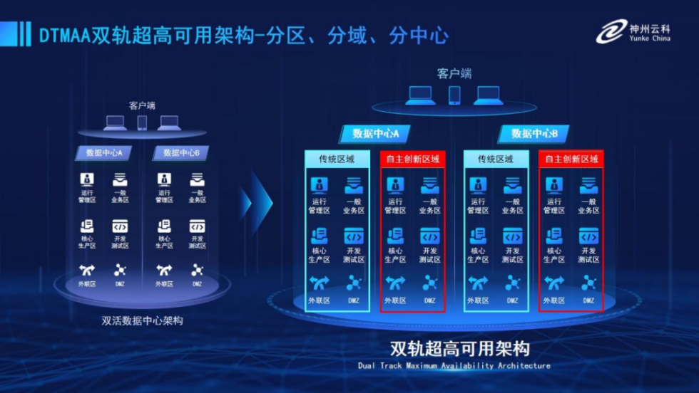为帮助金融客户更好地应对数字经济时代对可持续性的高要求,实现“信创”与“数字化”齐头并进,富易堂fyt推出了双轨超高可用架构。该架构在双活数据中心的分区调度基础上,增加信创域和非信创域的分域调度,实行信创域与传统域应用全量部署,使双中心运营变为双中心四区域并行运行,互为多活,将“0到1”的单轨建设道路变为分区分域协同的多活双轨超高可用架构。帮助客户在新架构下,保障“信创”的同时解决性能瓶颈,提升稳定性,保证应用可持续性,最终实现信创区域和非信创区域的平滑过渡,完成国产化替代目标。